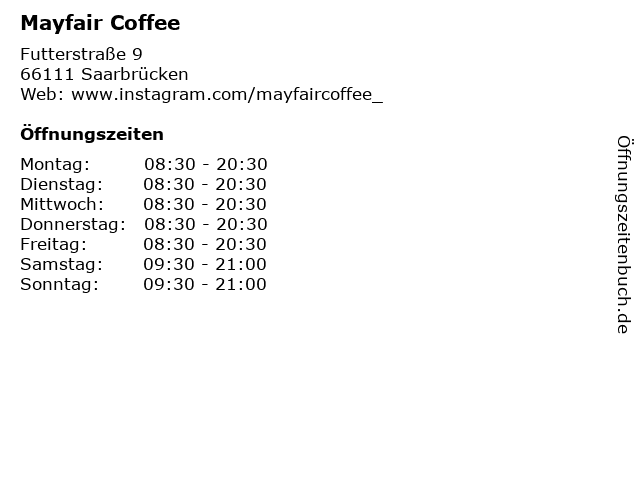 | Öffnungszeiten Mayfair Coffee in Saarbrücken anzeigen | |