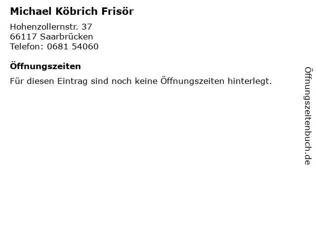 | Öffnungszeiten Michael Köbrich Frisör in Saarbrücken anzeigen | |