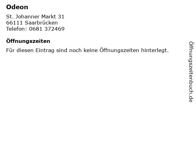 | Öffnungszeiten Odeon in Saarbrücken anzeigen | |