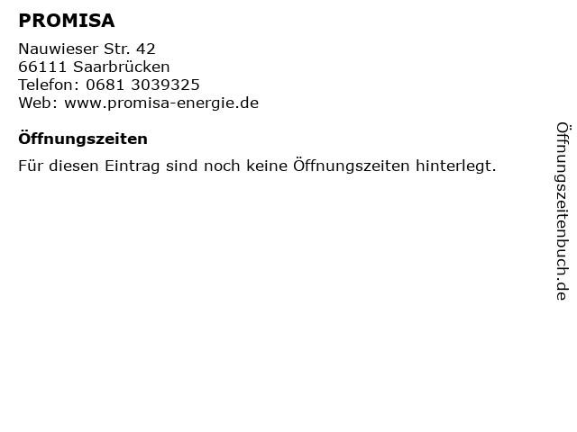 | Öffnungszeiten PROMISA in Saarbrücken anzeigen | |