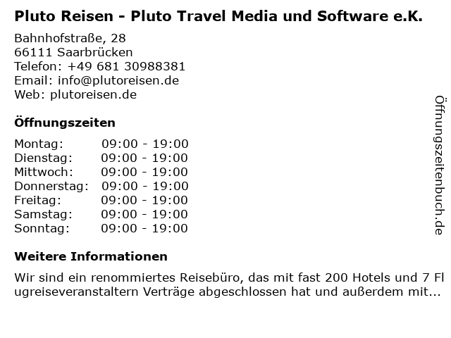 Öffnungszeiten Pluto Reisen - Pluto Travel Media und Software e.K.