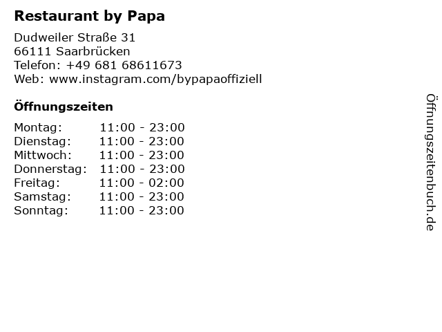 | Öffnungszeiten Restaurant by Papa in Saarbrücken anzeigen | |