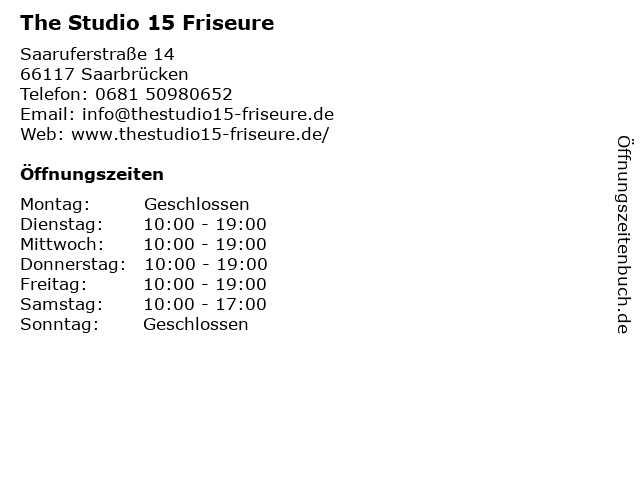 | Öffnungszeiten The Studio 15 Friseure in Saarbrücken anzeigen | |