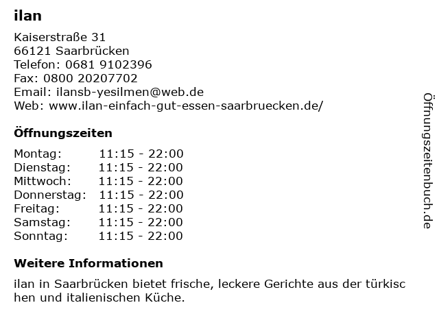 | Öffnungszeiten ilan in Saarbrücken anzeigen | |