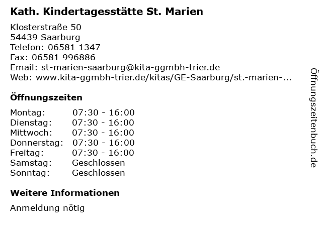 4 St. Marien Beurig, St. Gervasius u. Protasius Irsch, St. Valentin Ockfen/Schoden - Pfarrbüro (Entfernung: 0,12 km) Hauptstr. 47, 54439 Saarburg-Beurig 5 Kath. Kindergarten St. Marien (Entfernung: 11,31 km) Alfred-Becker-Straße 14, 66693 Mettlach-Orscholz 6 |