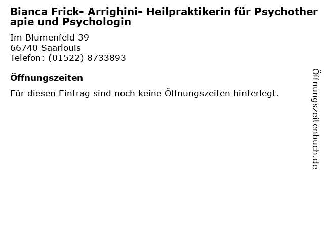 | Bianca Frick- Arrighini- Heilpraktikerin für Psychotherapie und Psychologin anrufen | |