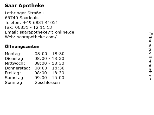 | Öffnungszeiten Saar Apotheke in Saarlouis anzeigen | |