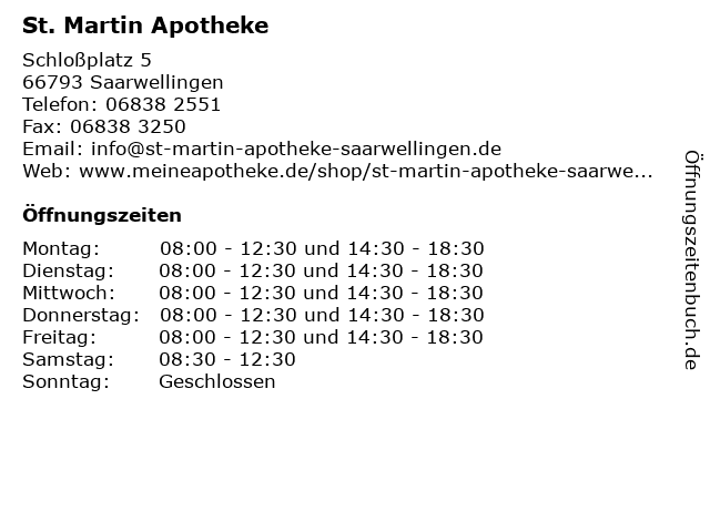 | Öffnungszeiten St. Martin Apotheke in Saarwellingen anzeigen | |