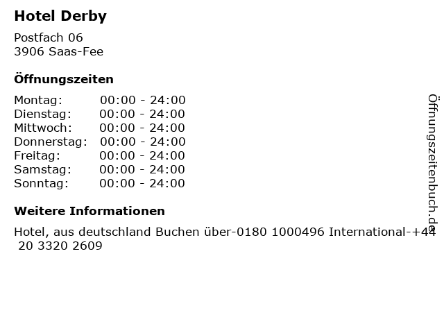 | Öffnungszeiten Hotel Derby in Saas-Fee anzeigen | |