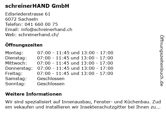 | Öffnungszeiten schreinerHAND GmbH in Sachseln anzeigen | |