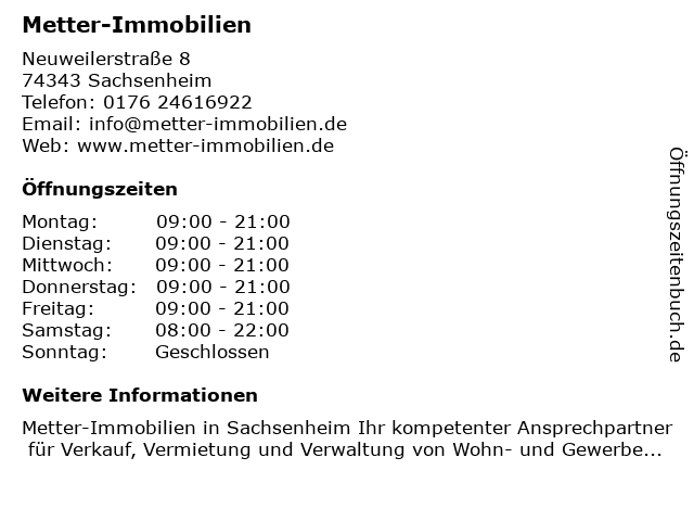 | Öffnungszeiten Metter-Immobilien in Sachsenheim anzeigen | |