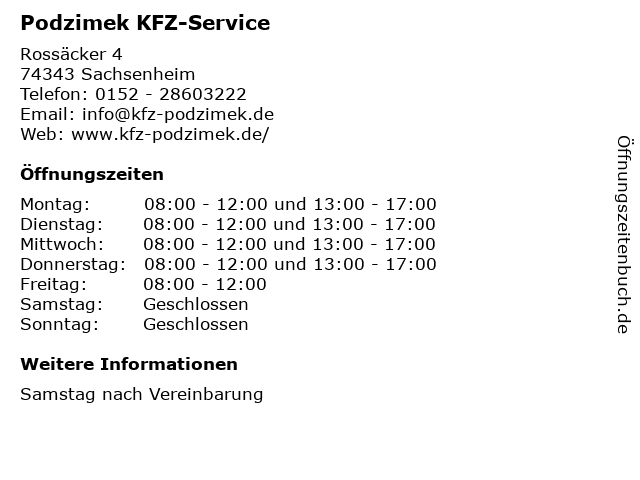 | Öffnungszeiten Podzimek KFZ-Service in Sachsenheim anzeigen | |