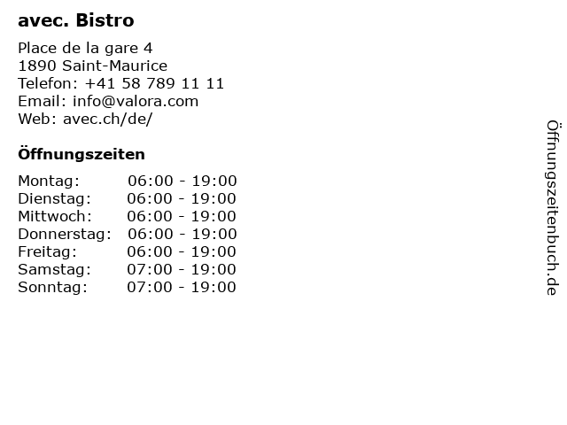 | Öffnungszeiten avec. Bistro in Saint-Maurice anzeigen | |