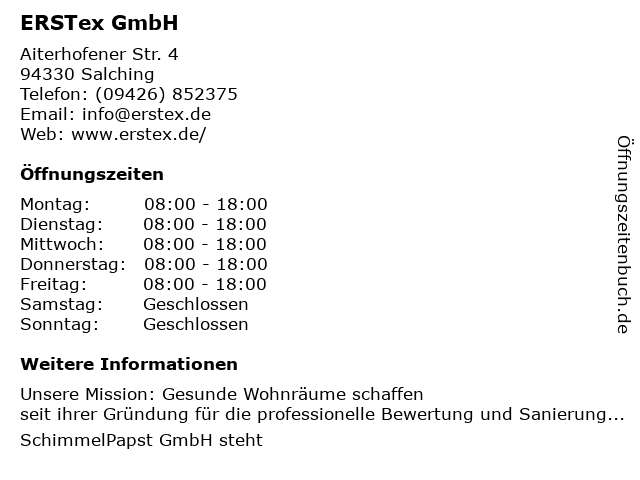 | Öffnungszeiten ERSTex GmbH in Salching anzeigen | |