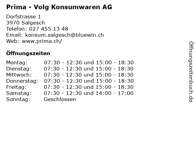 | Öffnungszeiten Prima - Volg Konsumwaren AG in Salgesch anzeigen | |