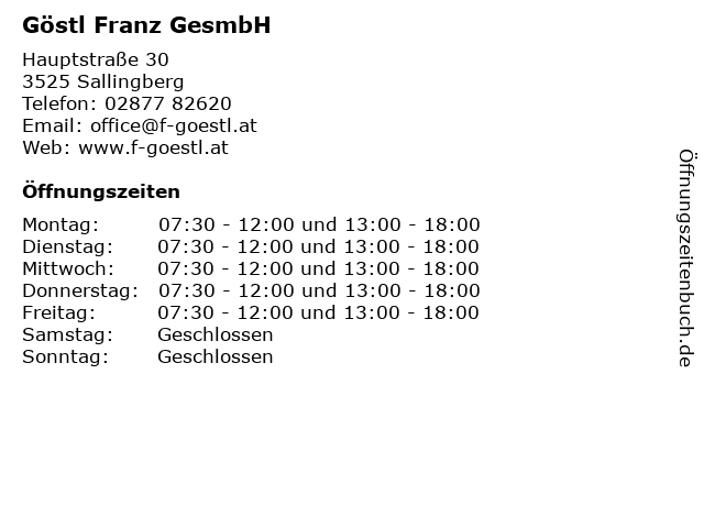 | Öffnungszeiten Göstl Franz GesmbH in Sallingberg anzeigen | |