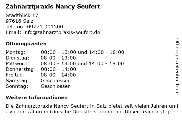 | Öffnungszeiten Zahnarztpraxis Nancy Seufert in Salz anzeigen | |