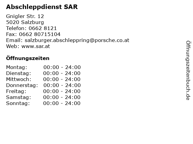 | Öffnungszeiten Abschleppdienst SAR in Salzburg anzeigen | |