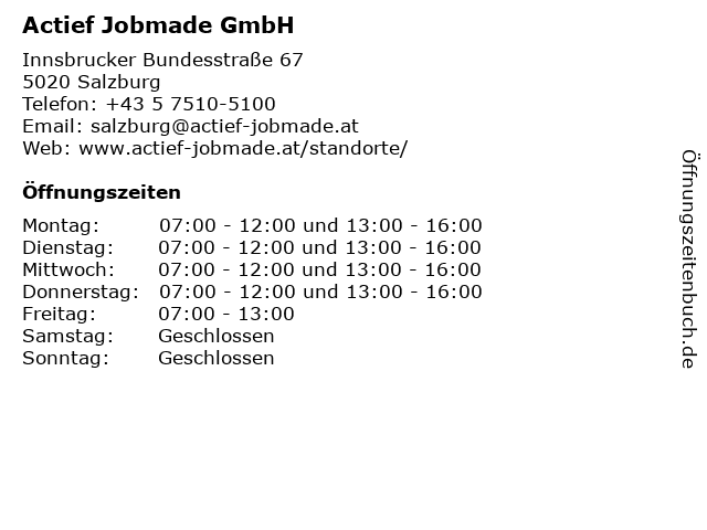 | Öffnungszeiten Actief Jobmade GmbH in Salzburg anzeigen | |