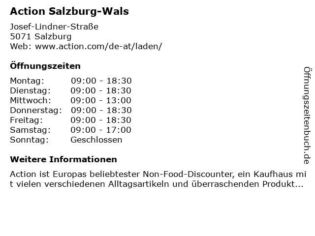 | Öffnungszeiten Action Salzburg-Wals in Salzburg anzeigen | |