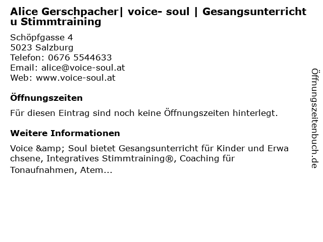 Branchen & Suchbegriffe zu Alice Gerschpacher| voice- soul | Gesangsunterricht u Stimmtraining:alice, gerschpacher|, gesangsunterricht, soul, stimmtraining, voice |