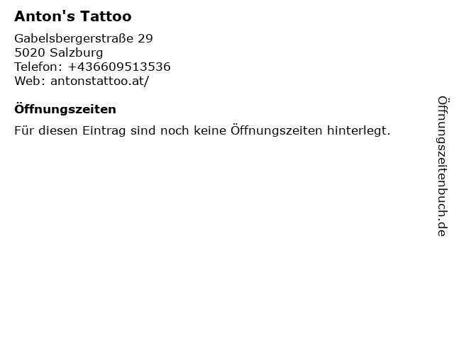 | Öffnungszeiten Anton's Tattoo in Salzburg anzeigen | |