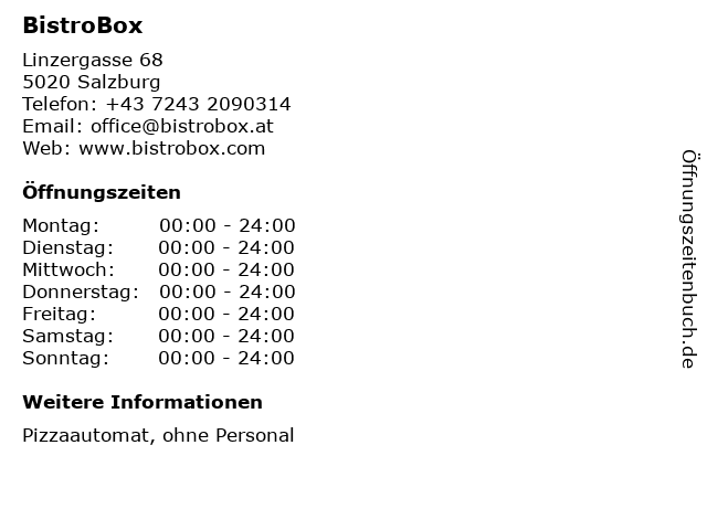 Öffnungszeiten BistroBox in Salzburg anzeigen | |