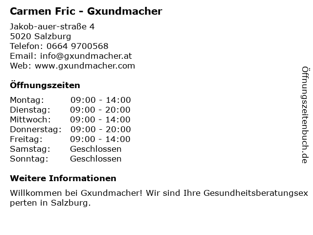 | Öffnungszeiten Carmen Fric - Gxundmacher in Salzburg anzeigen | |
