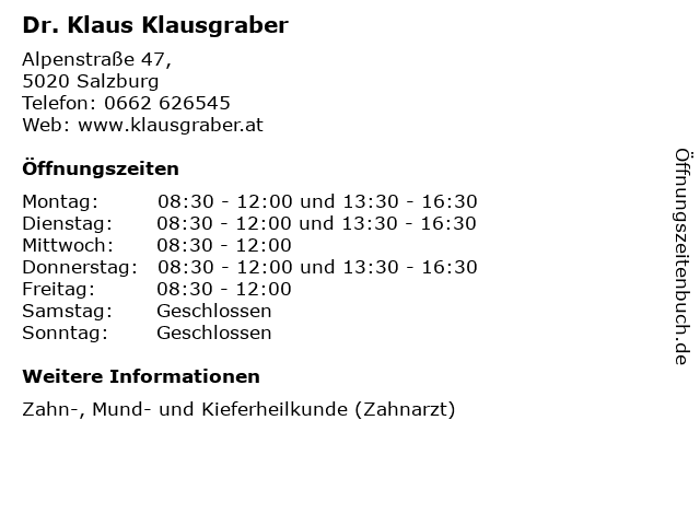 | Öffnungszeiten Dr. Klaus Klausgraber in Salzburg anzeigen | |