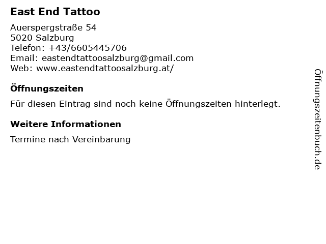 | Öffnungszeiten East End Tattoo in Salzburg anzeigen | |