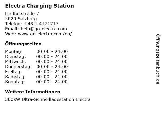 | Öffnungszeiten Electra Charging Station in Salzburg anzeigen | |