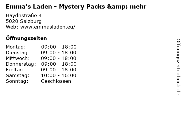 | Öffnungszeiten Emma's Laden - Mystery Packs & mehr in Salzburg anzeigen | |