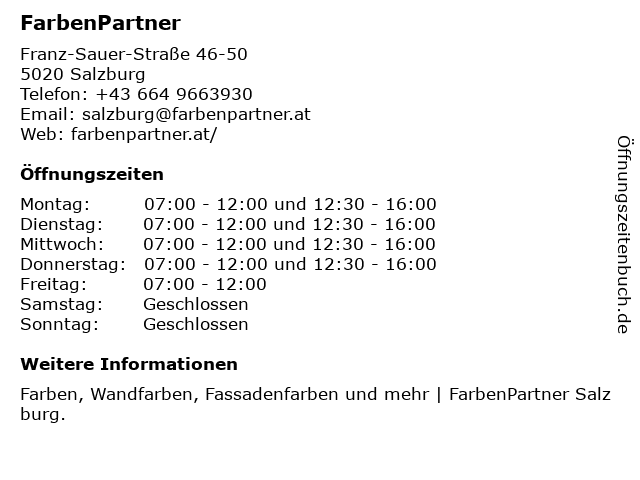 | Öffnungszeiten FarbenPartner in Salzburg anzeigen | |