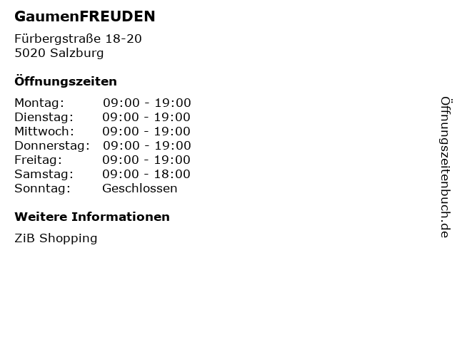 | Öffnungszeiten GaumenFREUDEN in Salzburg anzeigen | |