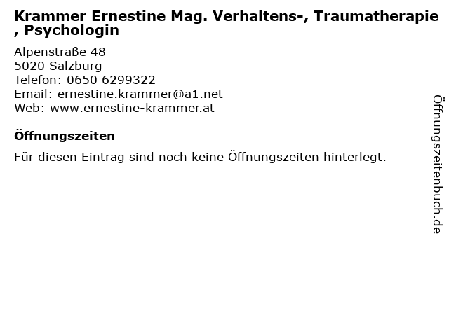 Branchen & Suchbegriffe zu Krammer Ernestine Mag. Verhaltens-, Traumatherapie, Psychologin:ernestine, krammer, mag., psychologin, traumatherapie, verhaltens |