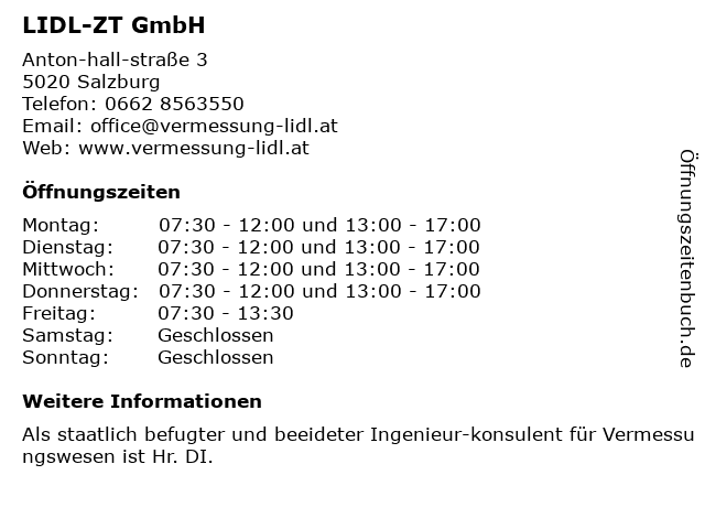 Öffnungszeiten LIDL-ZT GmbH in Salzburg anzeigen | |