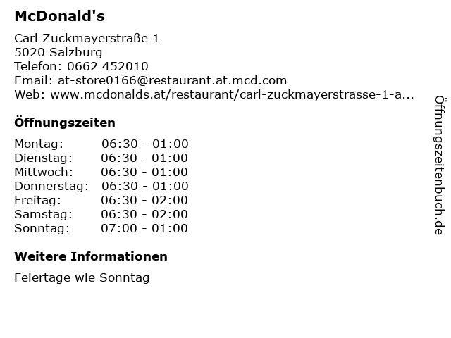 | Öffnungszeiten McDonald's in Salzburg anzeigen | |