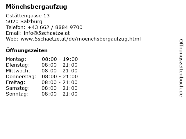 | Öffnungszeiten Mönchsbergaufzug in Salzburg anzeigen | |
