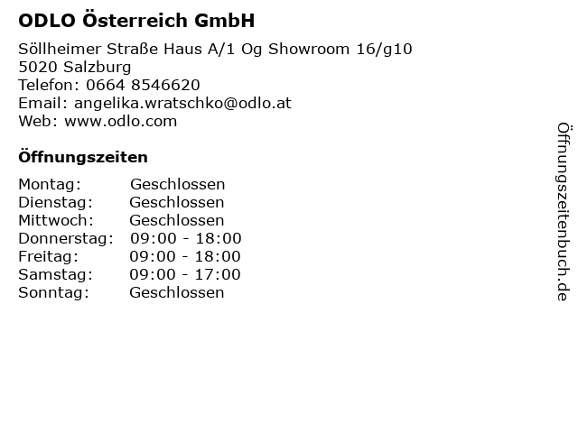 | Öffnungszeiten ODLO Österreich GmbH in Salzburg anzeigen | |