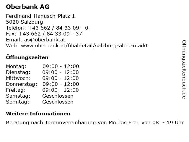 | Öffnungszeiten Oberbank AG in Salzburg anzeigen | |
