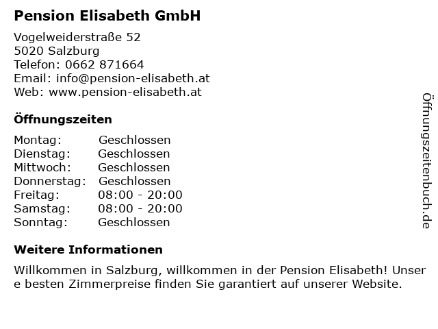 | Öffnungszeiten Pension Elisabeth GmbH in Salzburg anzeigen | |