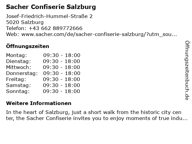 | Öffnungszeiten Sacher Confiserie Salzburg in Salzburg anzeigen | |
