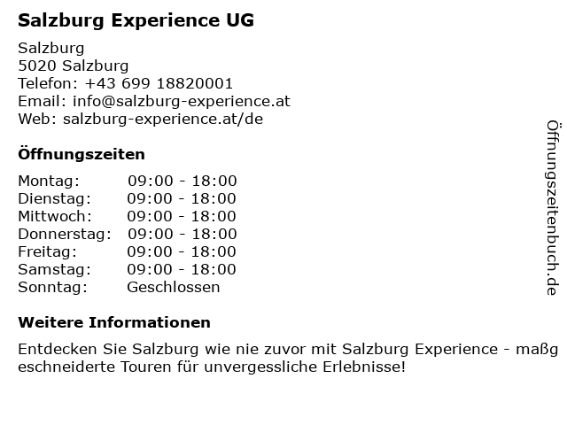 | Öffnungszeiten Salzburg Experience UG in Salzburg anzeigen | |