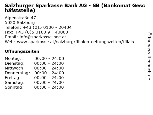 1 Salzburger Sparkasse Bank AG - SB (Bankomat Geschäfststelle) (Entfernung: 3,50 km) Maxglaner Hauptstraße 27, 5020 Salzburg 2 Salzburger Sparkasse Bank AG - Geschäftsstelle Josefiau (Entfernung: 0,00 km) Alpenstraße 47, 5020 Salzburg 3 Raiffeisenverband Salzburg eGen - (Bankomat Bankstelle - Outdoor) (Entfernung: 0,11 km) Alpenstraße 48, 5020 Salzburg 4 Raiffeisenverband Salzburg eGen - (Bankomat Bankstelle - Foyer, Indoor) (Entfernung: 0,11 km) Alpenstraße 48, 5020 Salzburg 6 |