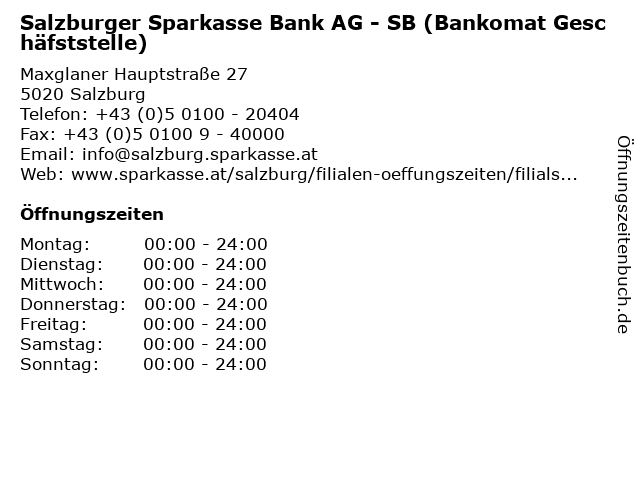 1 Salzburger Sparkasse Bank AG - SB (Bankomat Geschäfststelle) (Entfernung: 3,50 km) Alpenstraße 47, 5020 Salzburg 2 Salzburger Sparkasse Bank AG - Geschäftsstelle Maxglan (Entfernung: 0,00 km) Maxglaner Hauptstraße 27, 5020 Salzburg 3 Volksbank Salzburg eG - (Bankomat Filiale) (Entfernung: 0,28 km) Maxglaner Hauptstraße 2, 5020 Salzburg 5 Raiffeisenbank Salzburg Maxglan-Siezenheim eGen - (Bankomat Bankstelle) (Entfernung: 0,95 km) Innsbrucker Bundesstraße 34, 5020 Salzburg 6 |