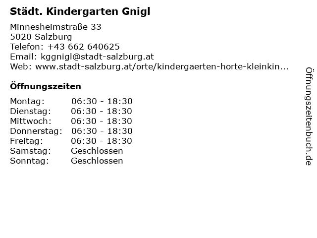 | Öffnungszeiten Städt. Kindergarten Gnigl in Salzburg anzeigen | |