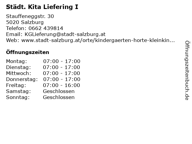 | Öffnungszeiten Städt. Kita Liefering I in Salzburg anzeigen | |