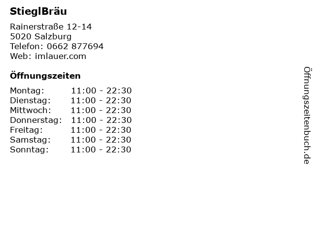 | Öffnungszeiten StieglBräu in Salzburg anzeigen | |