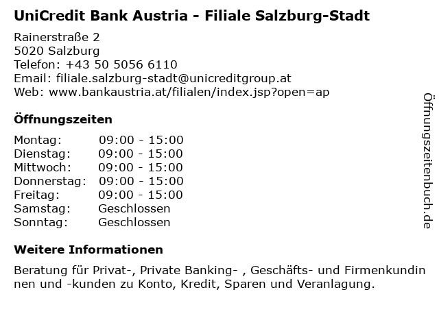 Branchen & Suchbegriffe zu UniCredit Bank Austria - Filiale Salzburg-Stadt:austria, bank, geschäfts- und firmenkundinnen und -kunden, privat-, private banking-, salzburg, stadt, unicredit |