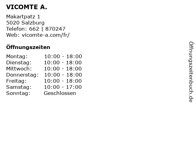 | Öffnungszeiten VICOMTE A. in Salzburg anzeigen | |